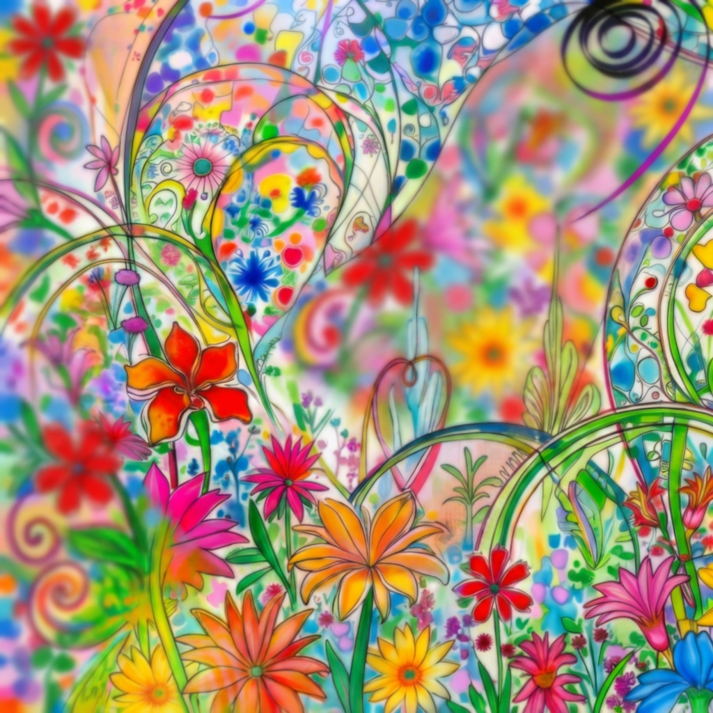 Первая картина представляет собой визуальный поток цветущей экстатической энергии, не имеющей ещё определённой формы. Яркие цветы, вихревые линии и насыщенные цвета создают ощущение бесконечного движения, роста и жизненной силы. Это пространство до воплощения, где энергия природы свободна, хаотична и потенциальна. Эта часть диптиха — как весна сознания, момент до рождения формы, когда энергия ещё не структурирована.