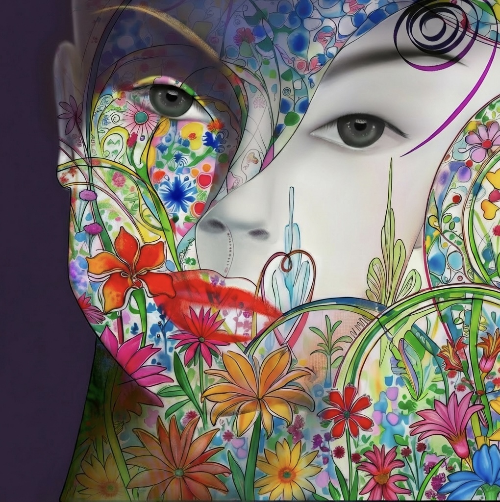 Глаза, выполненные в монохроме, контрастируют с яркими цветами, подчёркивая момент осознания и внутренней фокусировки. Слияние цветов и черт лица – метафора гармонии между внутренним и внешним. Жизнь – цикл, а не линейность, спираль в нашей энергетической матрице. Это – момент воплощения, когда энергия становится формой, личностью, сознанием. Преобразование цветущей энергии в форму, становление идентичности.