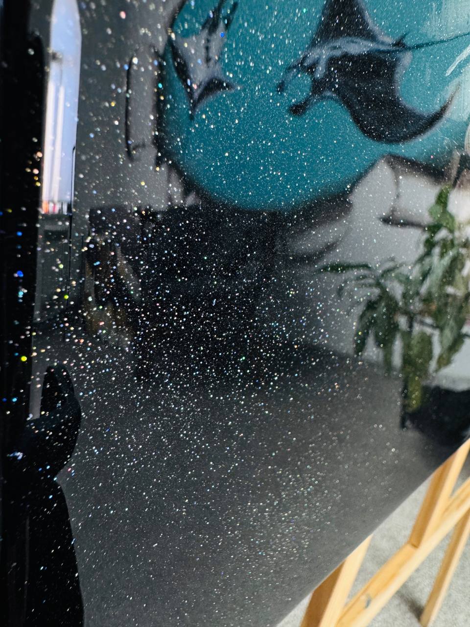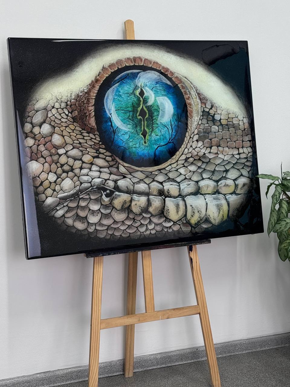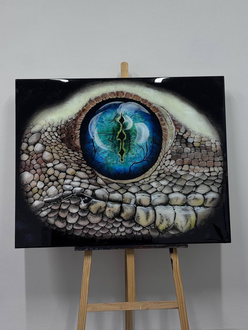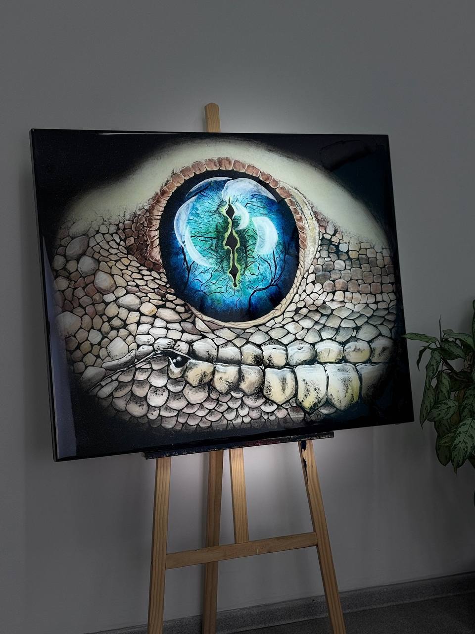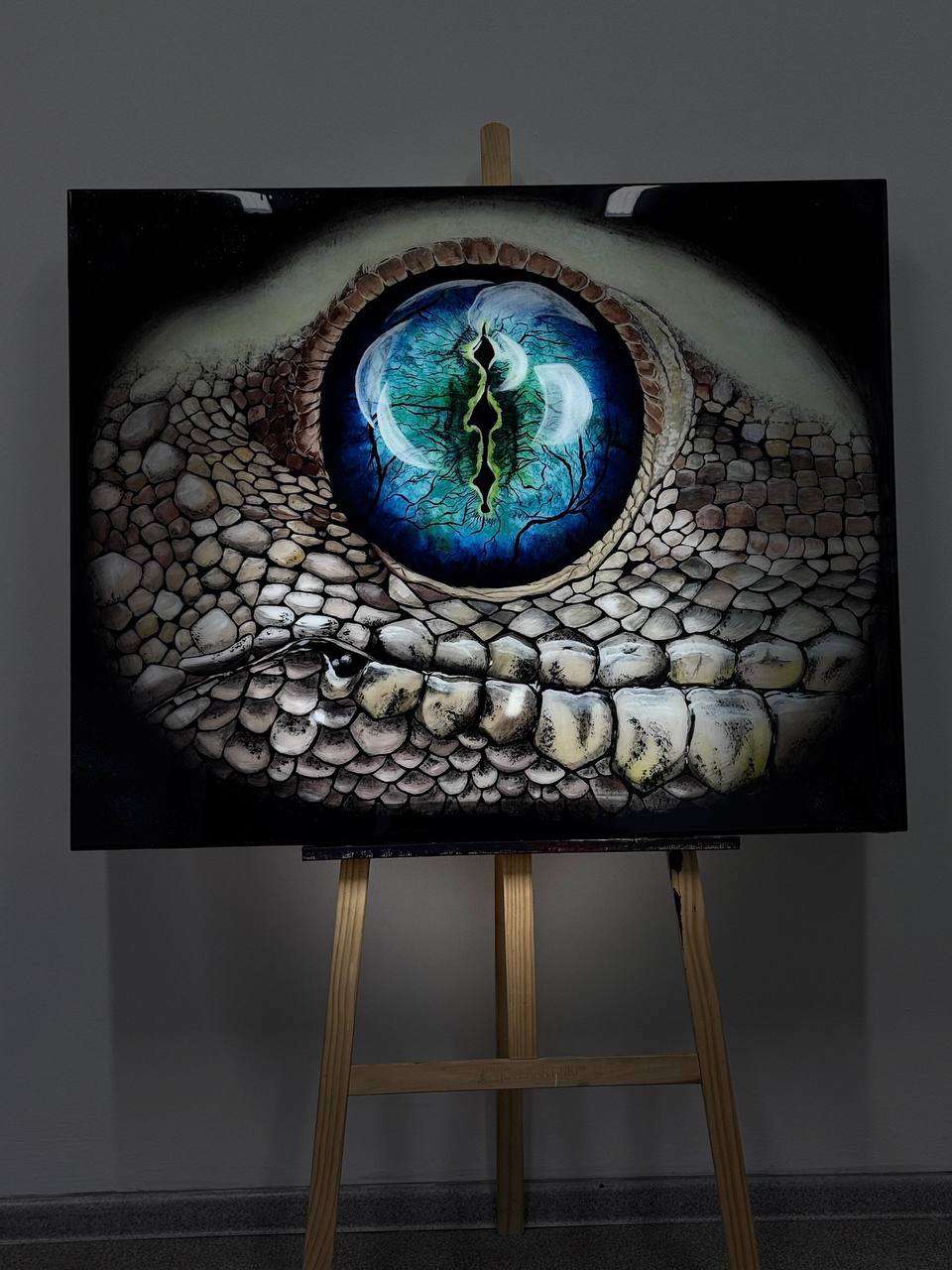 Тёмный фон усиливает ощущение глубины, создавая контраст и подчёркивая мистическую атмосферу. Кажется, что за этим глазом скрывается целый космос, полный тайн и древних знаний, а сам взгляд ящерицы – это взгляд существа, которое видело рождение миров. Поверхность картины вспыхивает миллионами звезд, когда солнечные лучи попадают на неё. Золотой шиммер переливается звенящими отблесками света.