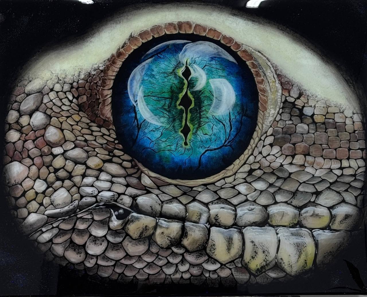 В центре композиции – огромный гипнотический глаз ящерицы, который притягивает взгляд и не отпускает. Его радужка переливается глубокими оттенками синего и зелёного, напоминая мистический водоём, в котором отражаются древние леса и таинственные руны. Трещины на радужке выглядят как магические письмена или разломы между измерениями, сквозь которые проглядывает нечто неизведанное.