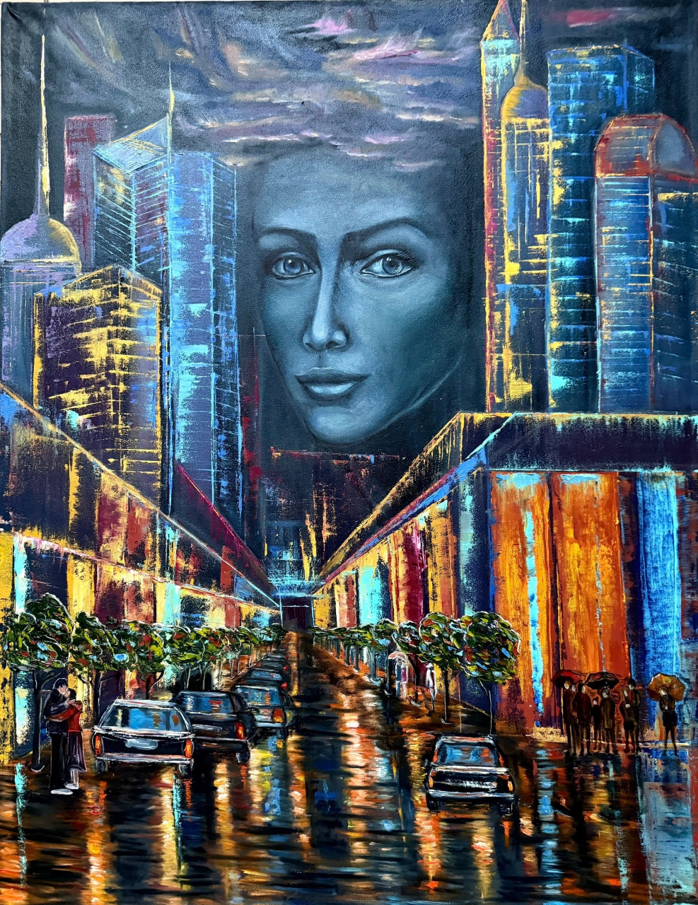 Жизнь не останавливается на улицах даже ночью: машины, пешеходы, сияющие витрины. Лицо девушки как бы проявляется из мрака на фоне яркого ночного города. Глаза девушки широко открыты, но она погружена в себя, в свои мысли и непонятно, что есть иллюзия: сверкающий город или она сама. Бывают у вас такие состояния, когда вы кажетесь себе то маленькой незначительной точкой в этом мире, то, наоборот — этим самым огромным миром. Ты в городе или город в тебе. Дуализм восприятия подчеркивается цветовым решением: лицо девушки ахроматично, а город разноцветен.