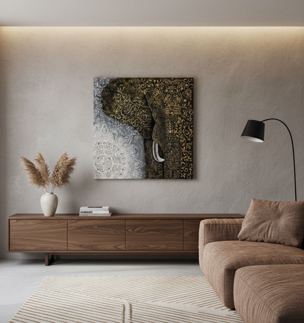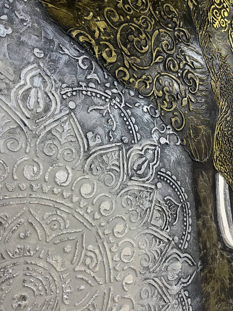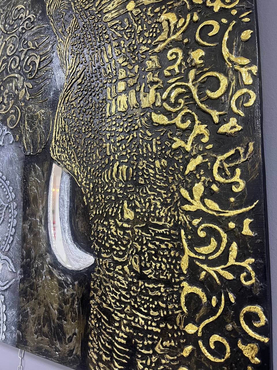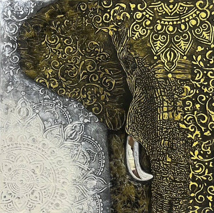 Картина «Индийский великан» от Альбины Жуковой — эксклюзивное украшение интерьера! Уникальная техника исполнения с использованием трёх типов текстурных паст, золотого и серебряного золочения придаёт полотну глубину и роскошь.