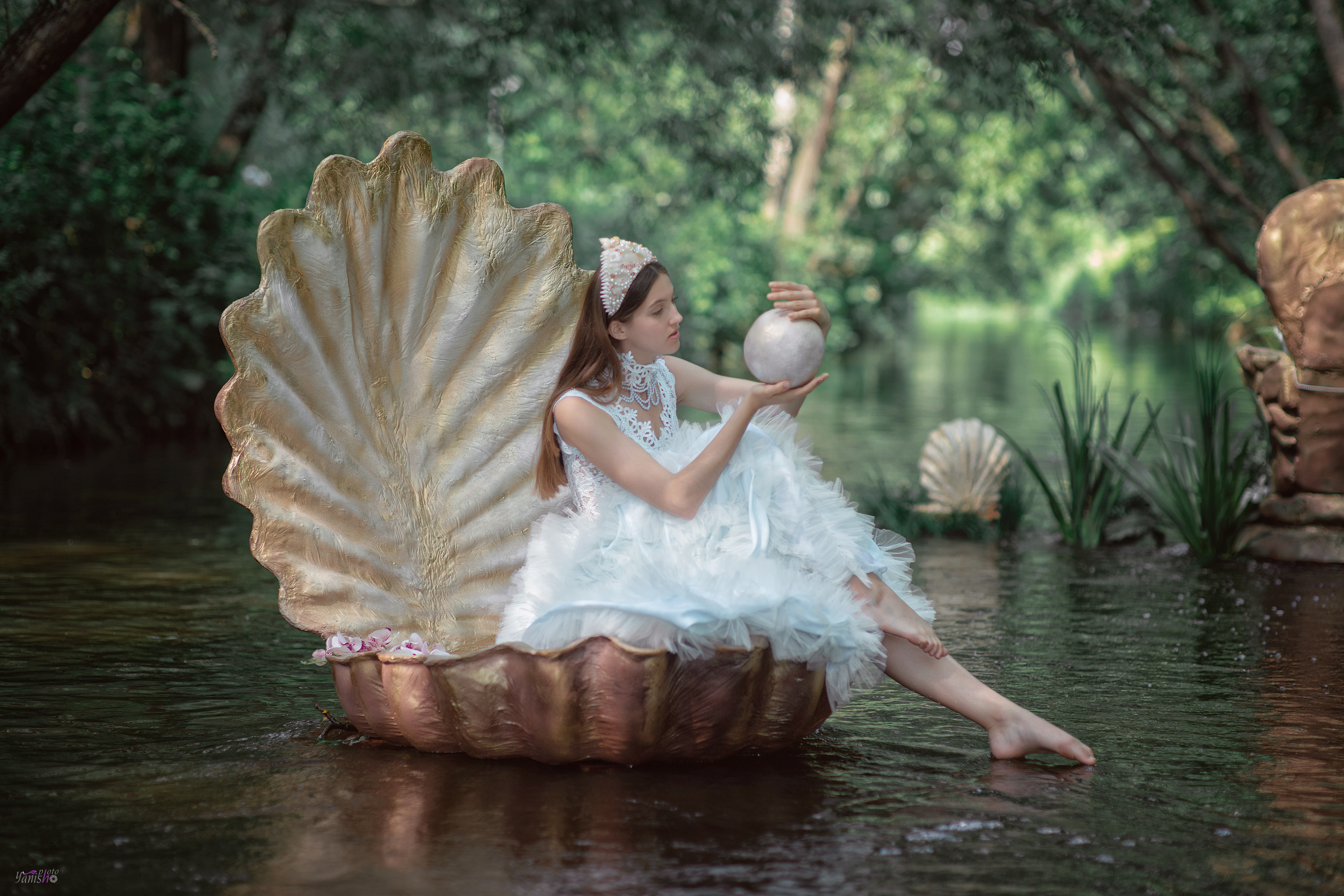 Художественная фоторабота украсит ваш интерьер магией искусства. Созданная в 2020 году на берегах реки Яуза в Москве, она очарует вас деталями – от уникальной короны из натуральных ракушек до выразительного образа модели.