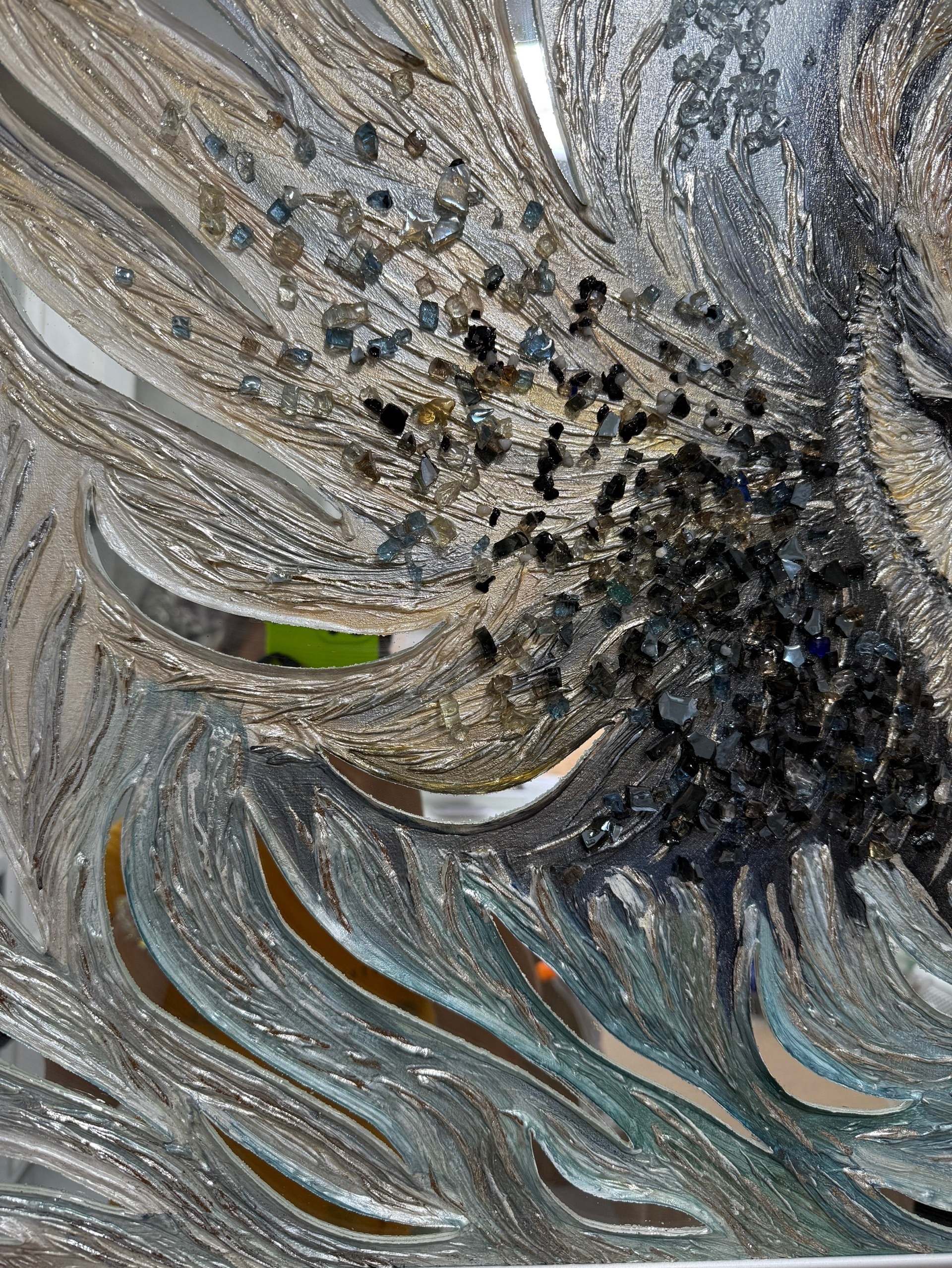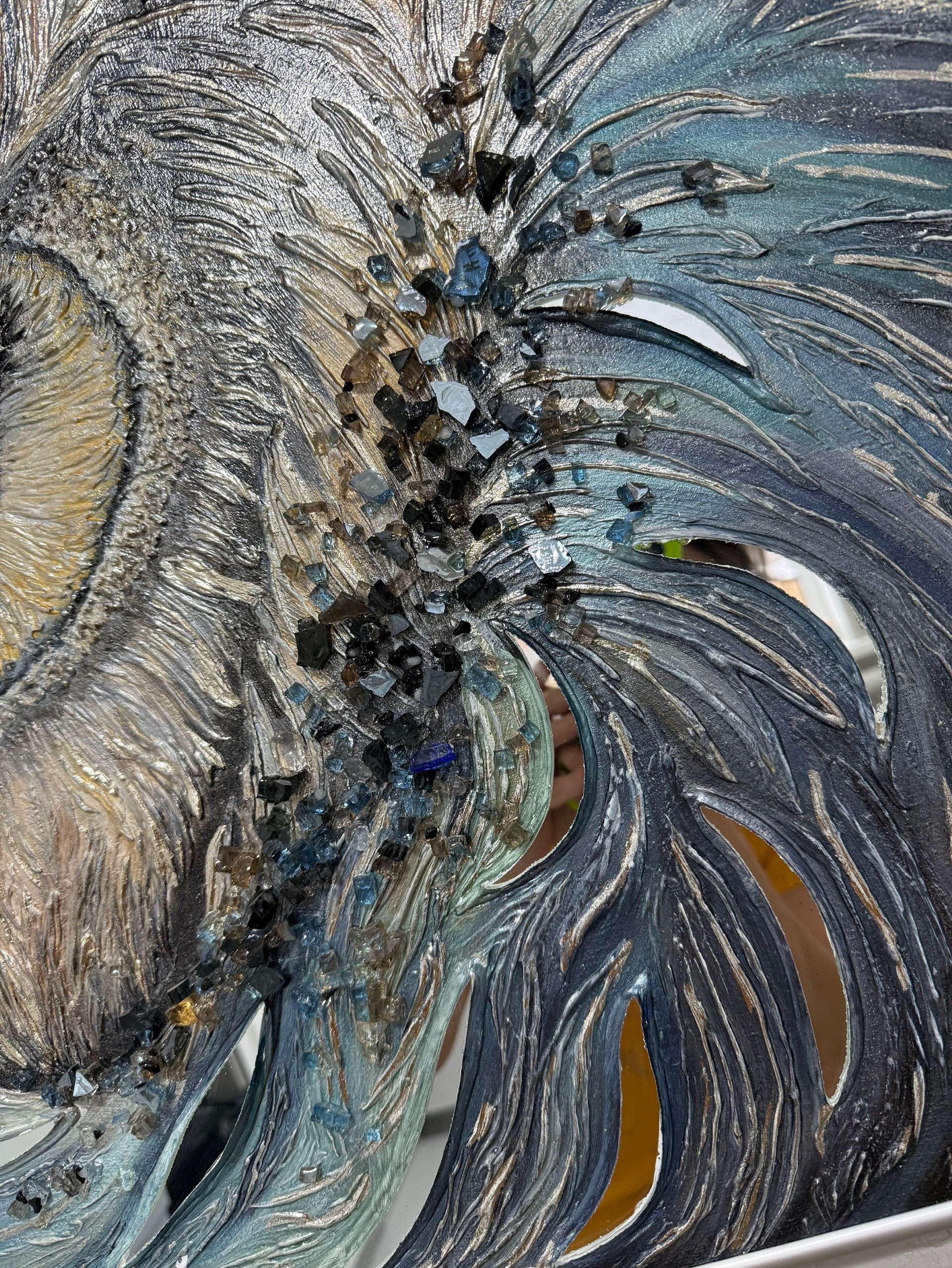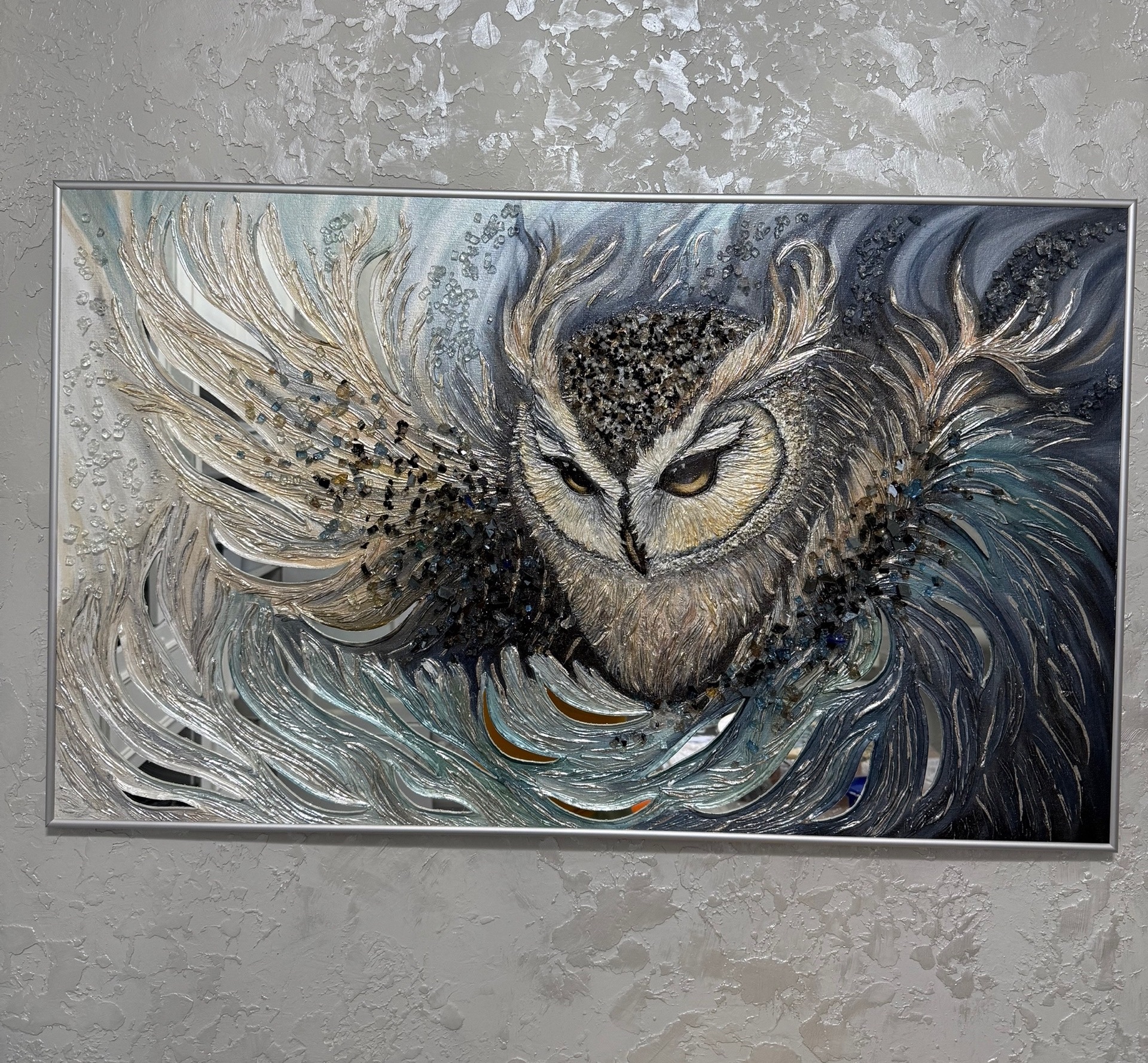 Картина «Мудрость» от художника Альбины Жуковой — стильный интерьерный аксессуар, выполненный на жёстком холсте 100x60 см с использованием золотой текстуры, ювелирной смолы и декора из горного хрусталя и зеркал. Ручная работа подчёркивает эксклюзивность изделия. Картины идеально впишутся в дизайн студии, салона или офиса, создавая атмосферу уюта и добавляя помещению индивидуальности и изысканности.