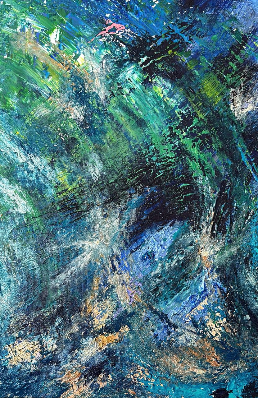 Картина звучит безмерной внутренней вселенной, что скрывается за мужской внешней сдержанностью, звучит глубиной, вихрями мыслей.Картина размышление о том, что истинная сила- это и есть способность вмещать в себя целый космос.