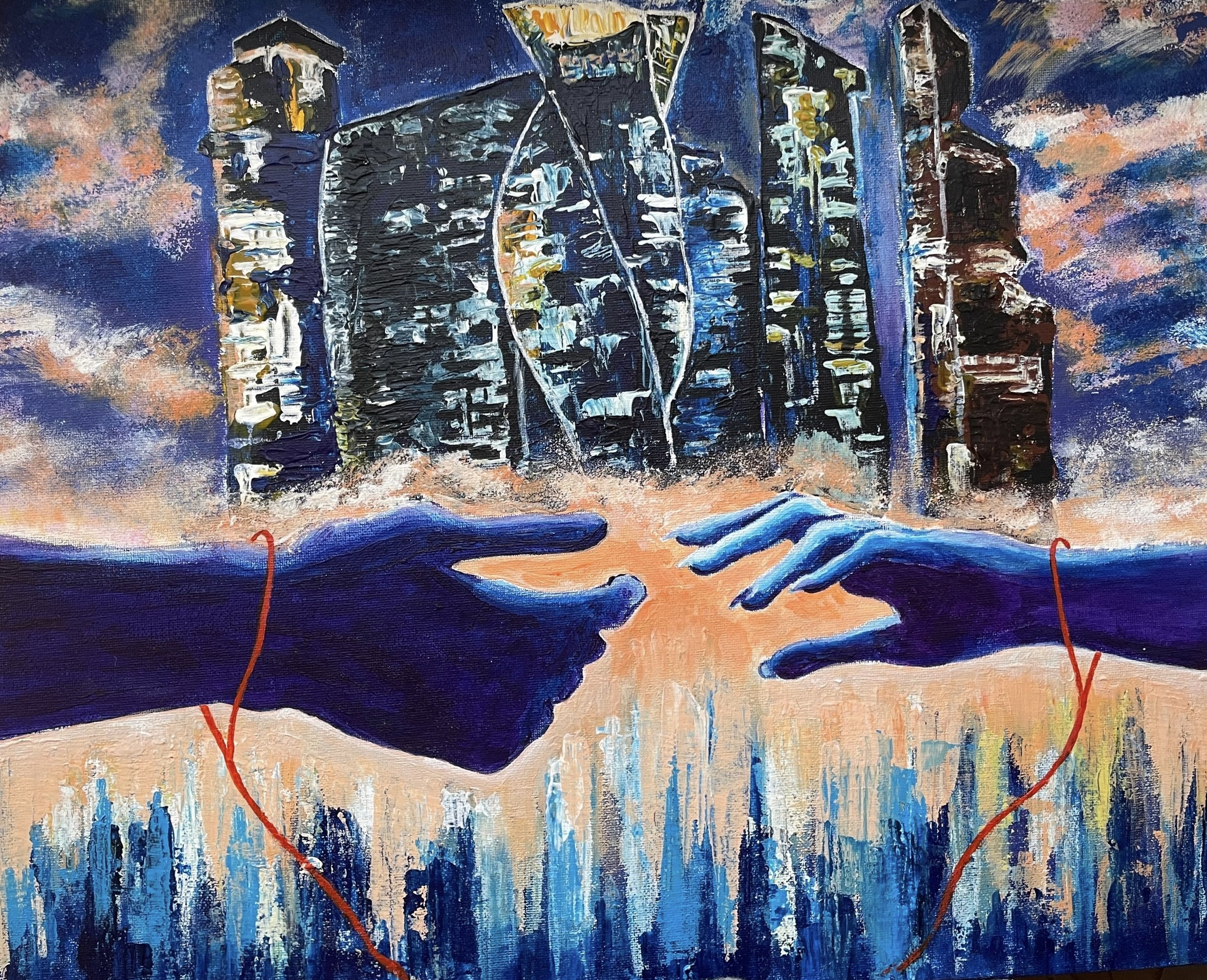 Картина написана художником Ольгой Тумановой г. Челябинск по мотивам стихотворения Бориса Рыжего. Это одно из любимых стихотворений художника. Оно философское и трагическое. Она увидела его вот в таких синих тонах. Оранжево-коралловые пятна усиливают контрастность и передают напряжение между протянутыми друг другу руками женщины и мужчины. Художник не знаю, расстанутся они навсегда или, может быть, встретятся вновь. Красная нить выходит за рамки картины, подчеркивая эту недосказанность, ведь зритель не видит, разорвана она или нет. Художник хотела бы дать надежду…