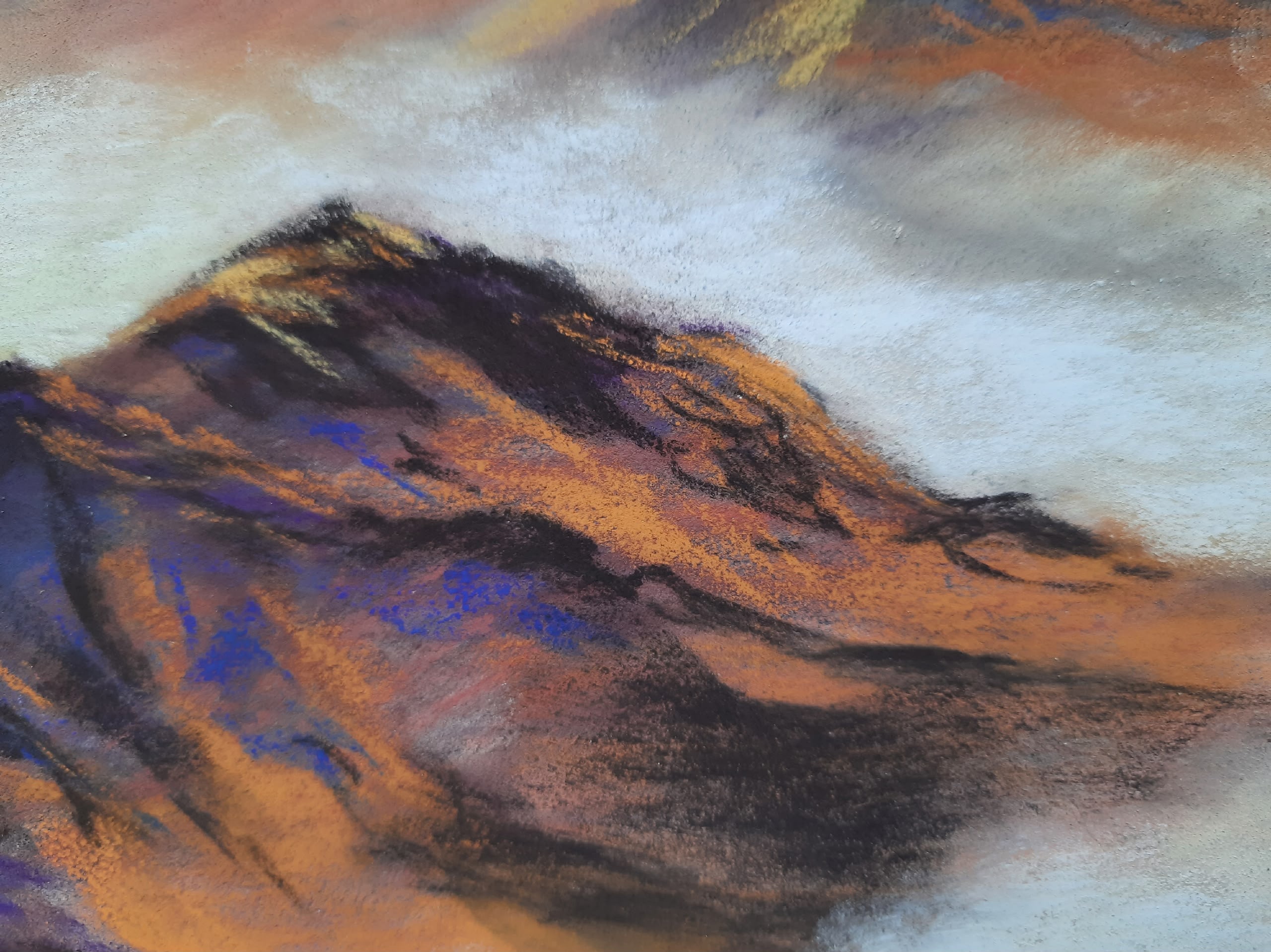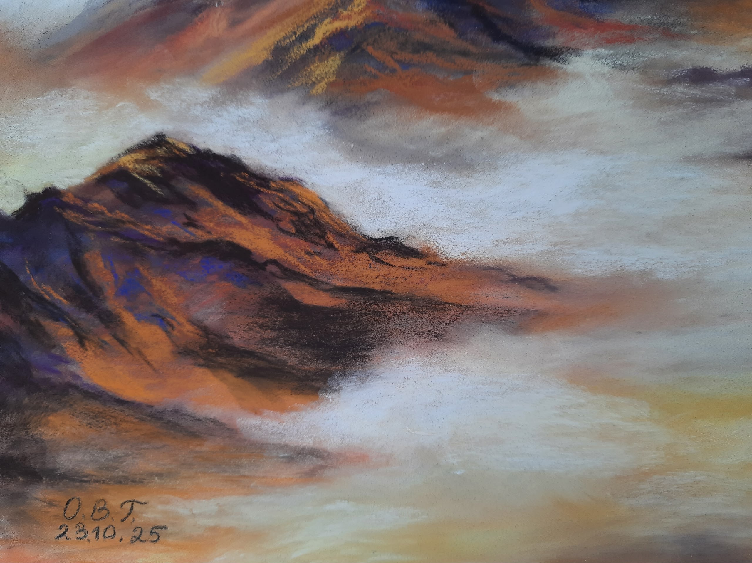 Фантазийный пустынный пейзаж с острыми пиками гор, выступающих из песка, облака затягивают небо и остался уже совсем маленький кусочек - он единственный на картине имеет нежно-голубой цвет, который контрастирует с общей цветовой гаммой рыжих, песочных оттенков. Безжизненный пейзаж, но у него есть динамика, движутся клубятся облака по небу, по земле ветер поднимает клубы песка и создает дымку, все это начинает закручиваться в единый вихрь движения, когда небо и солнце полностью затянет, то начнется буря. И тогда сольются небо с землей. А путникам лучше переждать эту стихию где-нибудь в укрытии. Ведь после бури всегда воцаряется затишь и небо очищается и сияет лазурью!
